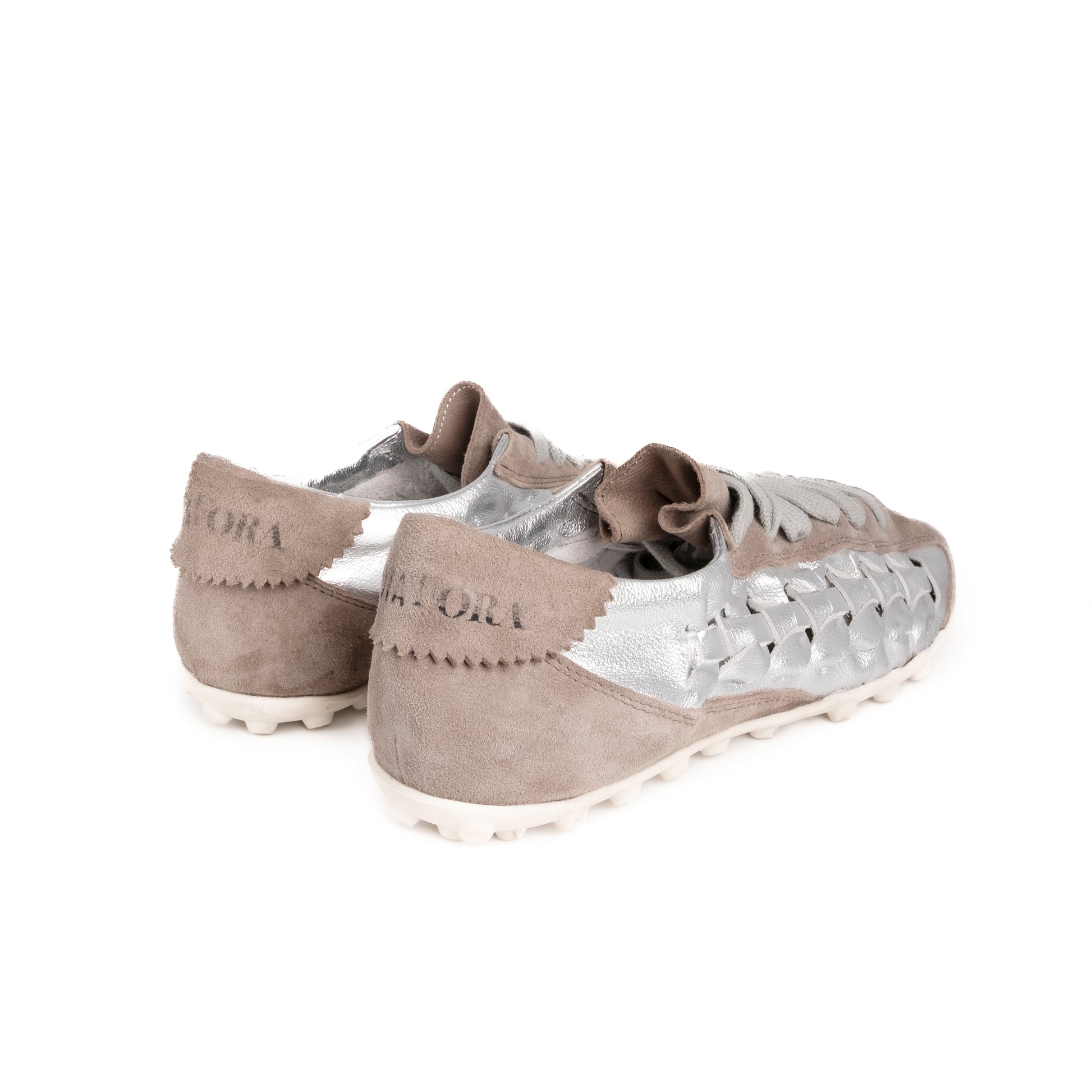 Crafted from high-quality materials, it combines a refined upper in soft beige suede with woven silver laminated leather side inserts, adding sparkle and character to the model. The contrast between the velvety texture of the suede and the metallic finish creates a sophisticated yet versatile aesthetic, ideal for completing casual chic outfits and sophisticated urban looks.
