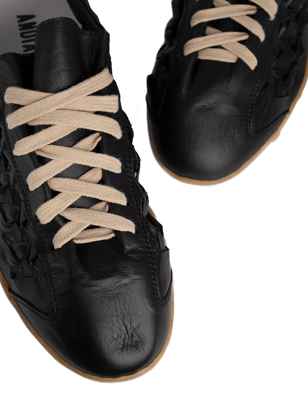 Realizzata in morbido pelle nera con inserti laterali in pelle  intrecciata, unisce eleganza e carattere. La fodera in pelle garantisce comfort e traspirabilità, mentre la suola in gomma flessibile assicura leggerezza e stabilità.